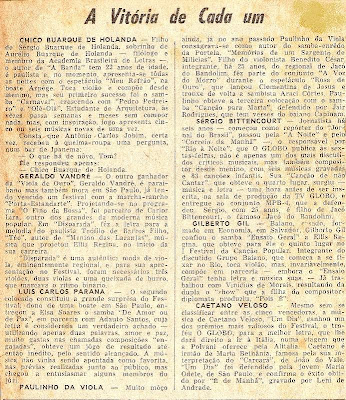 En el Jurado: César Camargo Mariano, Roberto Freire, Júlio Medaglia, Franco Paulino, Paulo Vanzolini, Alberto Medeiros, Denis Brean, Silvio Tulio Cardoso, Osmar Milani, Luis Guedes, Roberto Corte Real, Mário Lago.